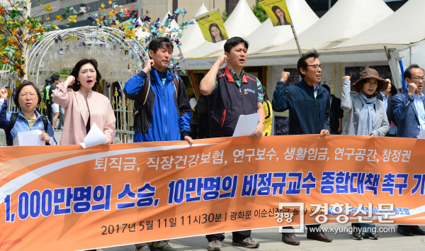 민주노총 한국비정규교수노동조합(비정규교수노조)은 11일 서울 광화문광장에서 기자회견을 열고 시간강사법 폐기 및 대체 입법, 비정규교수들의 교육과 연구 활동을 위한 예산 배정, 비정규교수들에 대한 처우 개선 등을 촉구했다.