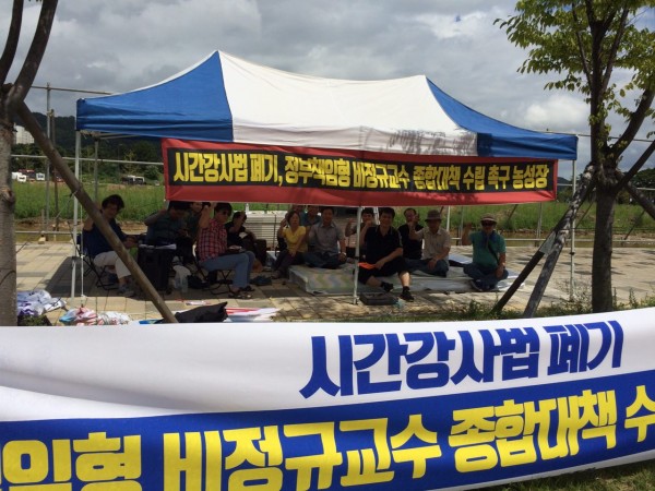 지난달 23일 한국비정규교수노동조합(한교조)이 세종시 교육부 앞에서 ‘시간강사법(고등교육법 제14조 제2항, 제14조의2)’ 폐기와 ‘정부 책임형 비정규교수 종합대책 수립’을 위해 무기한 노숙농성에 돌입했다. 2018년 1월 1일 시행될 시간강사법이 대규모 해고를 부른다는 이유에서다.