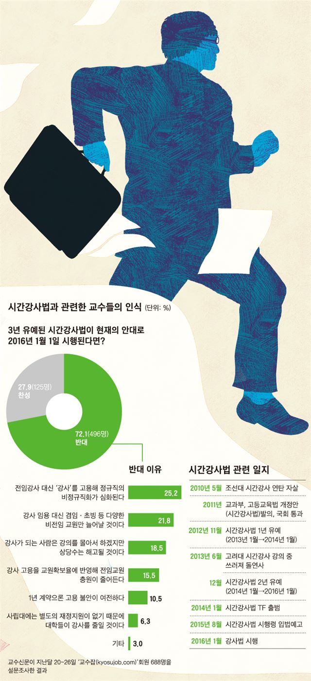 대학 강단에 서던 40대 가장은 그간의 부당 대우를 고발하는 유서만 5장 남긴 채 자신의 방에 연탄불을 피웠다. 2010년 조선대 시간강사 자살 사건. 이를 계기로 열악한 시간강사의 처우가 이슈로 떠올랐고, 정부는 이듬해 부랴부랴 고등교육법 개정안을 내놓았다. 그간 ‘아르바이트생’ 취급 받던 시간강사를 학교 직원으로 인정하고, 6개월이었던 계약기간을 1년으로 연장하는 내용이 담겼다. 이 법은 ‘시간강사법’(강사법)으로 불린다.