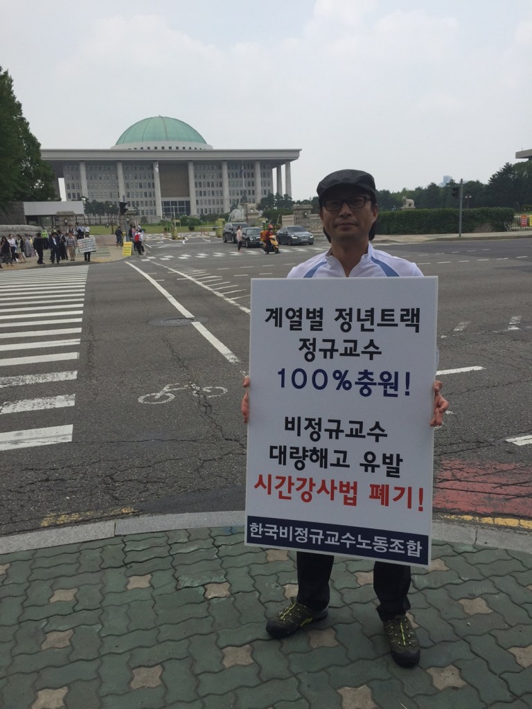 그래서 저희는 강사법을 직접 재정했던 국회가 나서서 이 강사법에 대한 보완작업 혹은 강사법 폐지 촉구를 위해 국회 앞에서 1인 시위를 하고 있습니다.