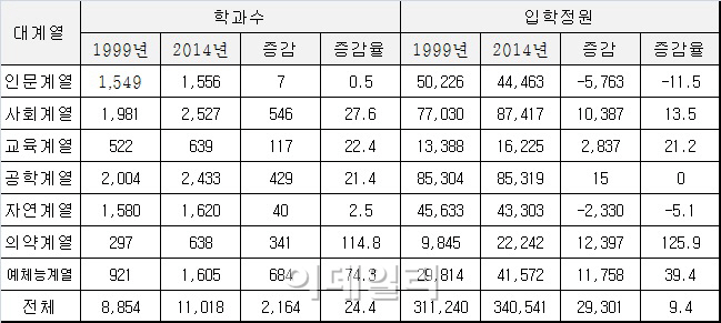 15년간 대입정원 3만명 증가했는데 인문계열 5763명 감소
