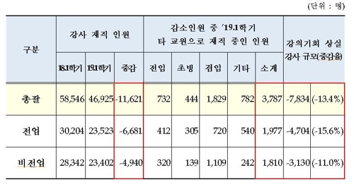 비전업 강사까지 포함할 경우 지난해 1학기와 비교해 올해 1학기 전체 강사 중 13%인 7천830여명이 강의 기회를 상실한 것으로 나타났다. 대학들이 강사법 시행에 앞서 강사들을 상당수 줄일 것이라는 우려가 현실화한 것으로 분석된다.