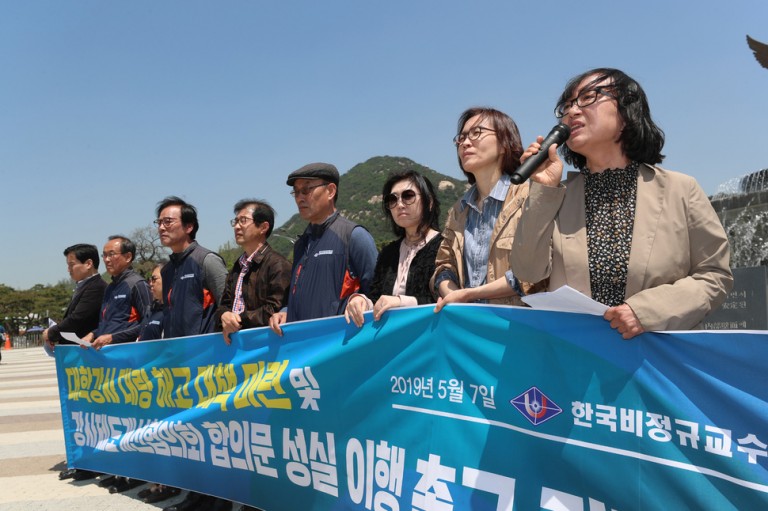 한국비정규교수노동조합(한교조)은 7일 오전 서울 청와대 앞에서 기자회견을 열고, “최근 대학정보공시 결과를 보면, 대학들이 ‘강사법’을 회피하고 교육환경을 파괴하는 등 ‘반교육적 폭거’를 저지르고 있는데, 교육부와 국회는 이를 방관하고 있다. 교육부와 국회는 ‘강사법’ 안착을 위한 환경을 조성해야 한다”고 주장했다. 이들은 4월30일 공개된 대학정보공시 분석 결과를 바탕으로 삼아, 2019년 1학기 강의 배정을 받지 못한 강사들이 1만~1만5000명 가량이라고 추산했다. 특히 이들은 국공립대보다 사립대에서, 사립대 중에서도 비수도권보다 수도권에서 강사 담당 학점 등이 크게 줄어들었다는 점을 지적했다.(관련 기사 : ‘강사법 앞두고… 대학들, 시간 강사 강의 비중 대폭 줄였다’)